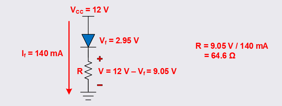 Then take the desired forward current, 140 mA, and use Ohm’s Law to calculate the resistance.