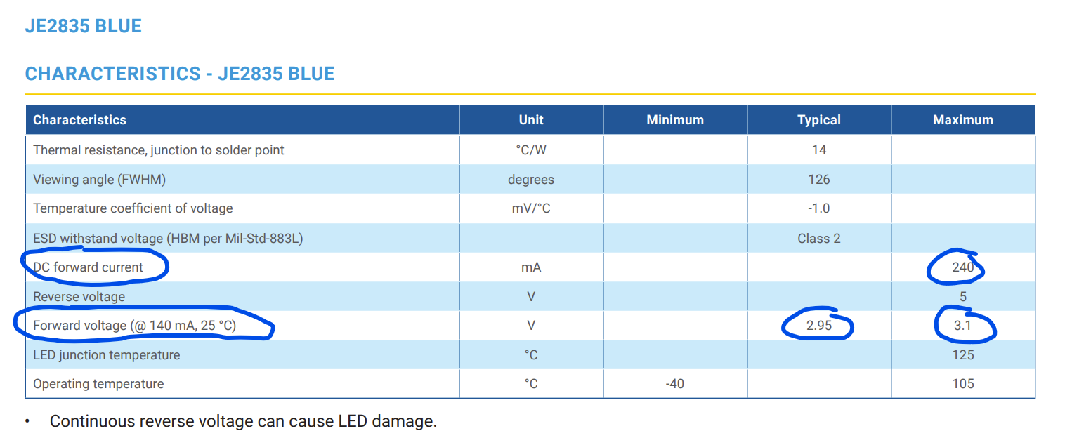 First step is to gather some information from the LED’s datasheet. Let’s look at a blue LED the JE2835 from Cree LED. The characteristics for the blue LED start on page 15 / 91 in the datasheet.
