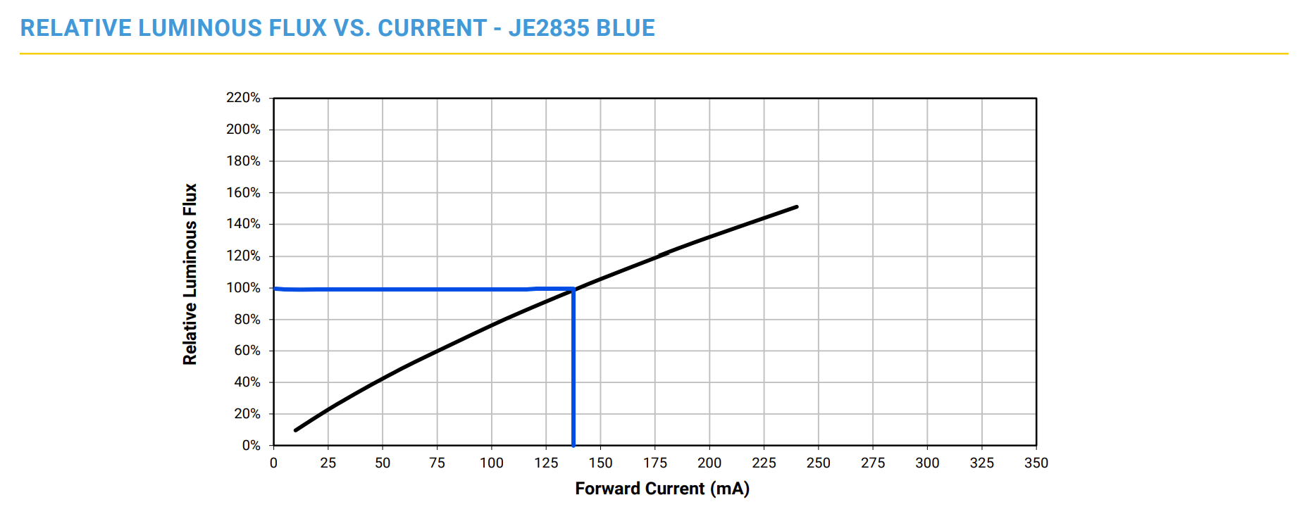 The relative luminous flux vs. current table shows the point at which the light source is operating at its typical or specified total light output. At 100%, the forward current If = 140 mA.