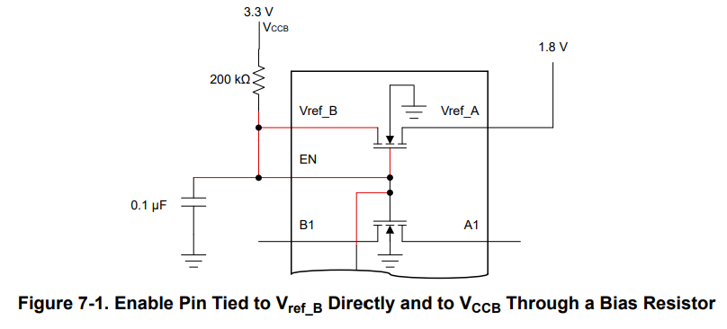 Switch mode is slightly different, but requires that VCC1 and VCC2 are the same voltage. The EN pin is controlled by an external GPIO, where the high logic voltage does not exceed VREF2 + VTH, where VTH is ~0.6V according to the datasheet.