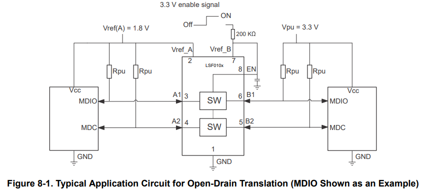 Page 12/42 of LSF0102 Datasheet - Typical Application Circuit for Open-Drain Translation (MDIO Shown as an Example)
