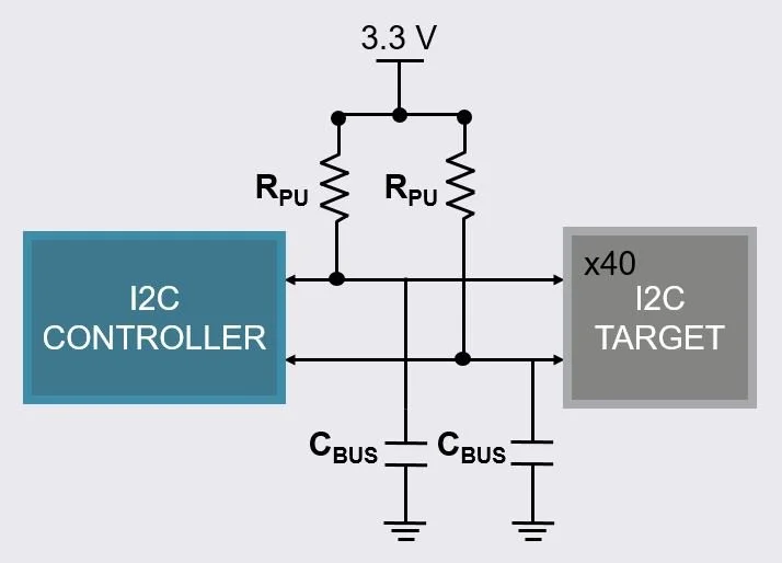 The image below shows an I2C controller connected to 40 other targets in a single I2C bus system. If you estimate that each controller and target in the system has about 10 pF of input capacitance, you are already above the limit suggested by the I2C standard.
