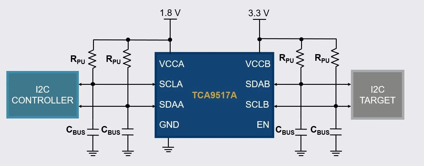 The image below is an example block diagram of using Texas Instruments TCA9517A I2C buffer.