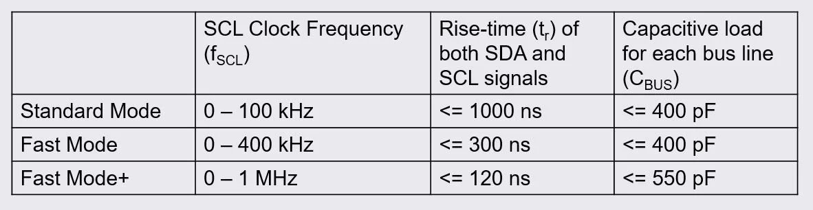 The I2C bus standard by NXP has specific rise-time and capacitive loading requirements for each mode of operation. The three most common modes of I2C operation are standard mode, fast mode, and fast mode+. See the table below for the system level requirements for each of the three modes: