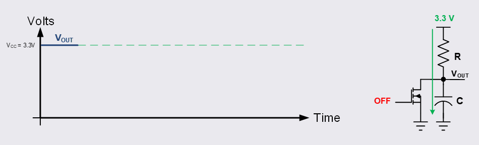 In the final state, the open-drain driver switches to the OFF position, turning off the nFET. This takes us back to the original case where the capacitor begins charging back up to VCC through the pull-up resistor.