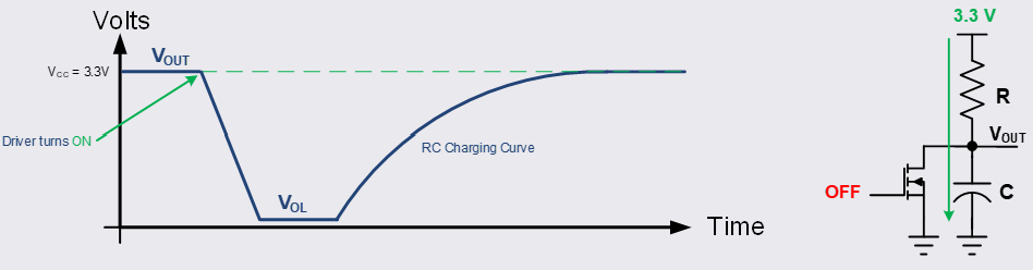 The open-drain driver discharges the capacitor to a VOUT = VOL.